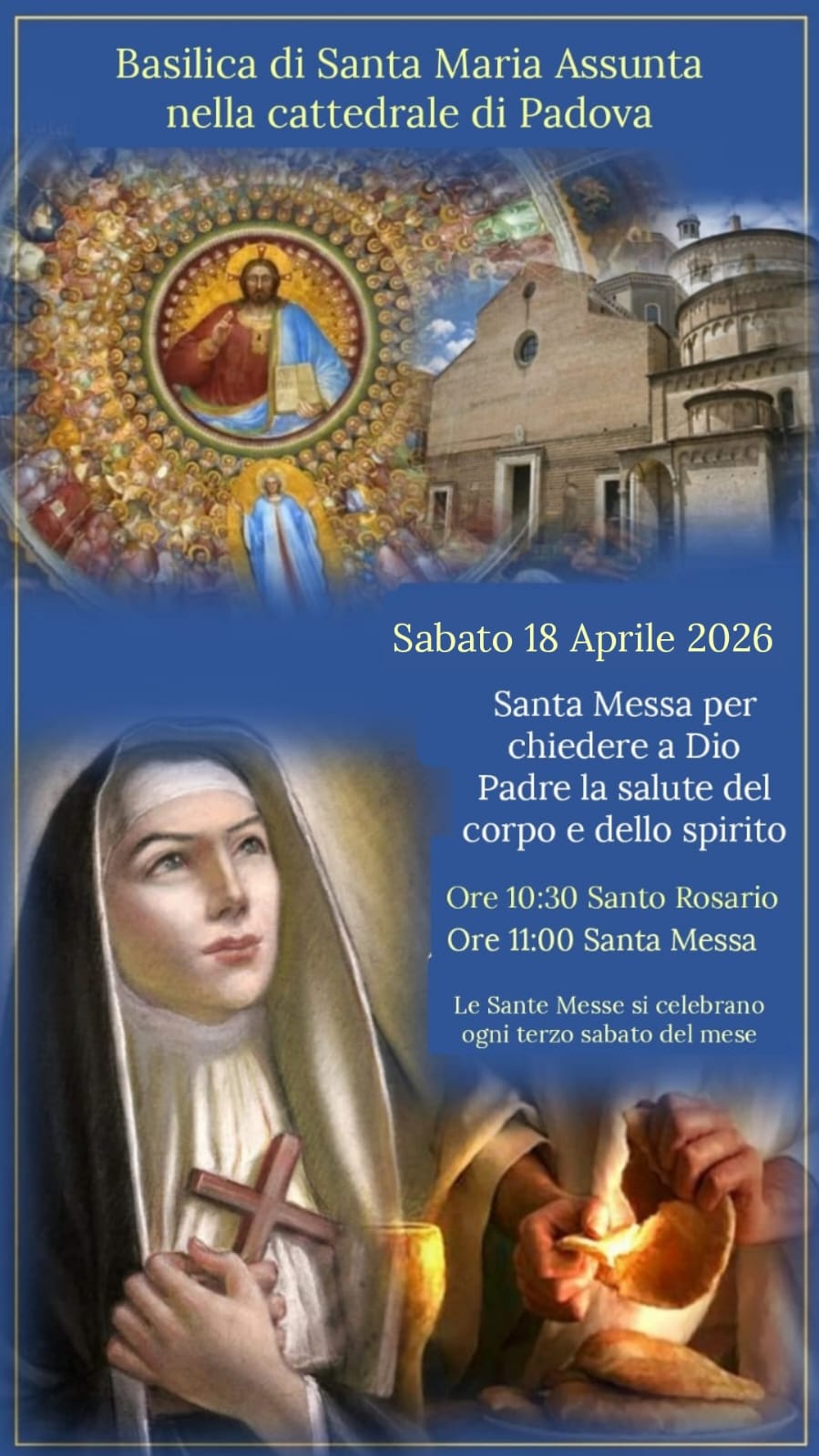 Si comunica che il prossimo 18 aprile 2026, presso la Cattedrale di Padova (Duomo di S. Maria Assunta), sarà celebrata la S. Messa del terzo sabato del mese, in ricordo della Beata Eustochio (Lucrezia) Bellini, sepolta presso la basilica.